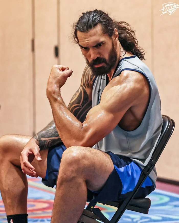 早在雷霆时期,亚当斯就被球迷冠以“卡锋”的绰号,靠着篮下的卡位本领给威少创造了不少拿篮板一条龙的机会。他在罚球时喜欢向对手炫耀自己的双臂肌肉,但真正让他成为联盟前板王、史诗级掩护墙的,反而是核心与下肢力量。