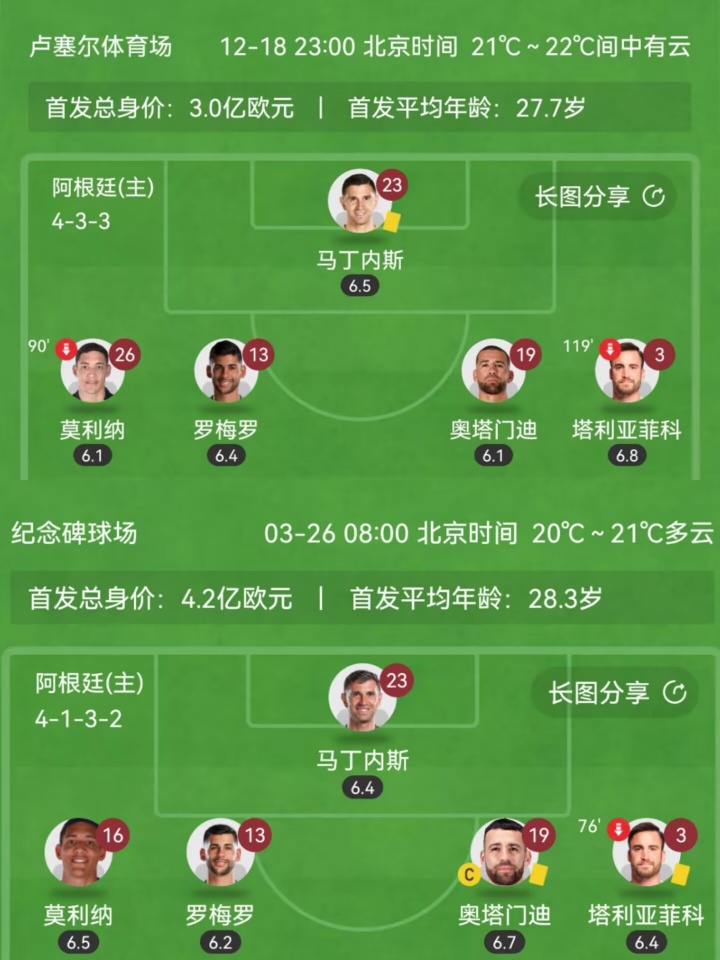 上为22年世界杯决赛阿根廷3-3法国首发 下为25年世预赛阿根廷3-1巴西首发